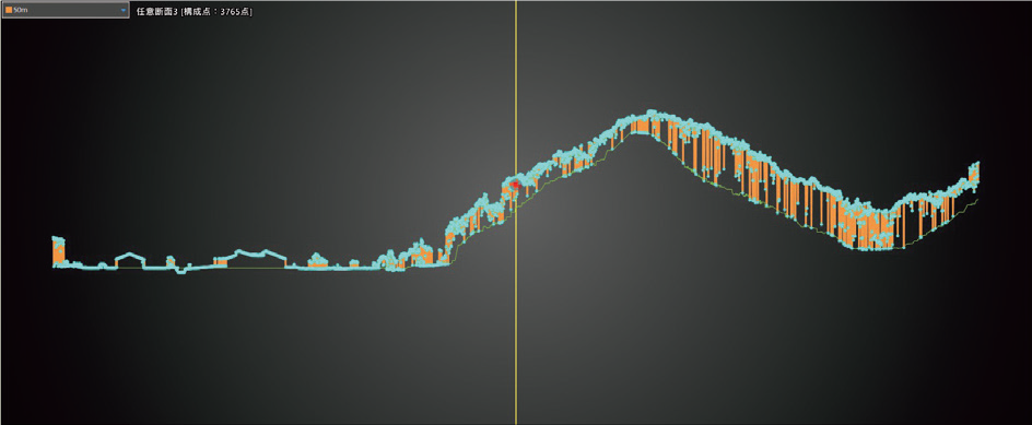 | 2人1組で1週間ほど必要だった測量が1人で30分ほどの時間で完了となるため大幅なコストダウンが見込めます。 | 従来の測量であれば縦横断測量は事前に中心線を設定しそれに沿って点と線で測量していましたが、3次元測量の点群データでは測量後にパソコン上で任意の縦横断測量が可能です。また、測量後の3次元設計やICT施工へと繋げられます。 |